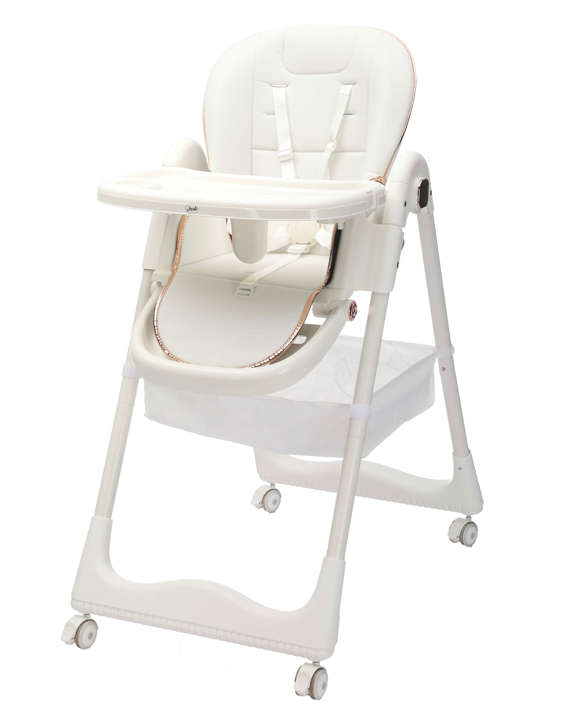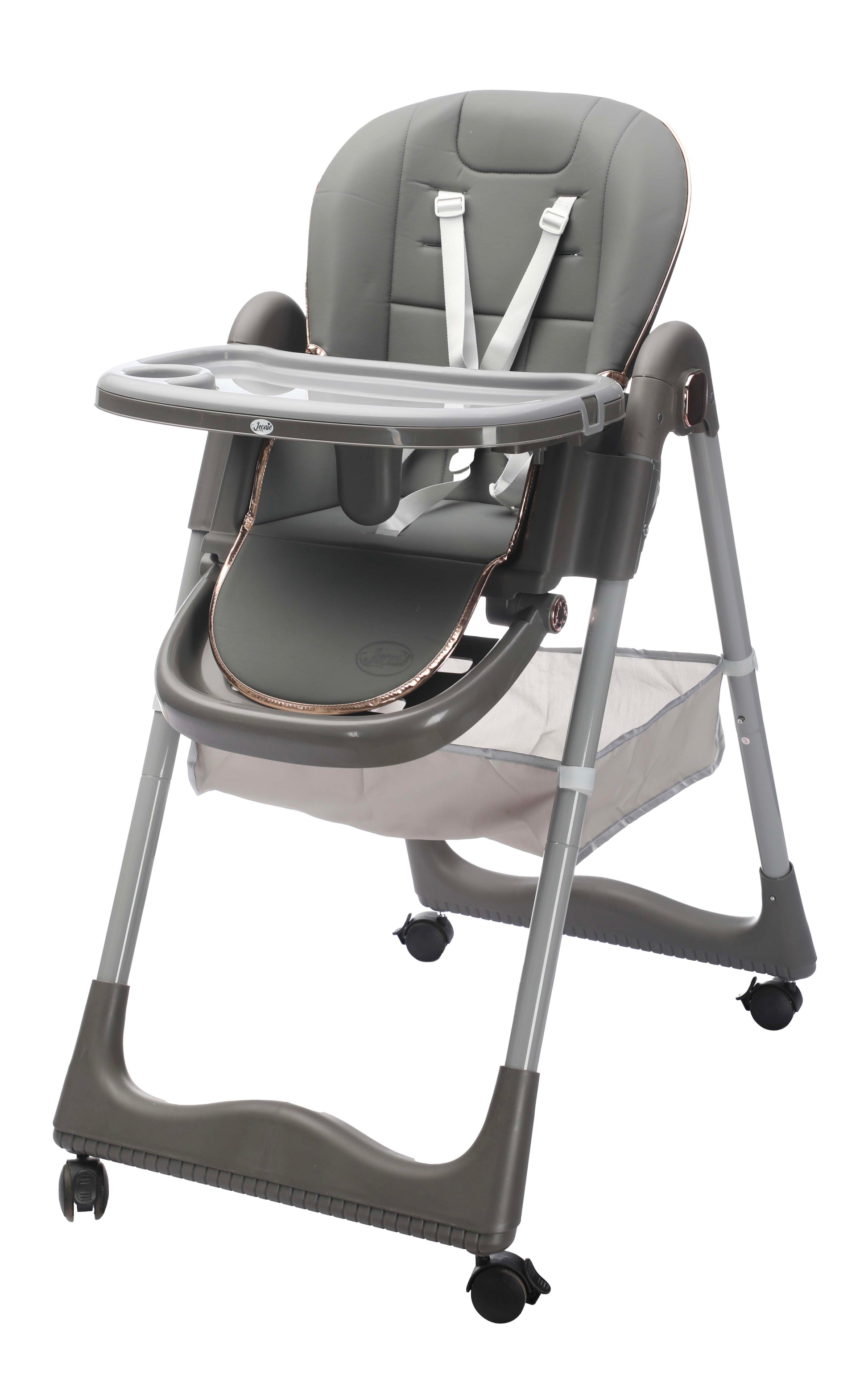 Set composto da seggiolone, bavaglino in silicone, scodella, cucchiaio e forchetta;cuscino in PU;4 ruote con fermi;vassoio pappa a 2 strati;4 posizioni del vassoio pappa;3 posizioni dello schienale;5 posizioni di altezza;3 posizioni dell'angolo del poggiapiedi; spallacci; sistema di ritenuta a 5 punti.