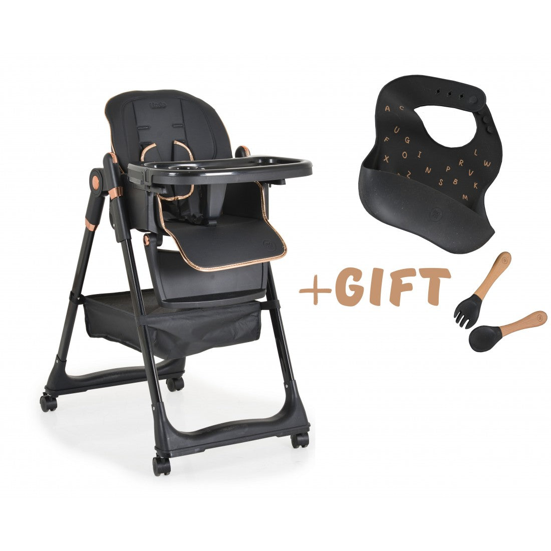 Set composto da seggiolone, bavaglino in silicone, cucchiaio e forchetta;cuscino in PU;4 ruote con fermi;vassoio pappa a 2 strati;4 posizioni del vassoio pappa;3 posizioni dello schienale;5 posizioni di altezza;3 posizioni dell'angolo del poggiapiedi; spallacci; sistema di ritenuta a 5 punti.